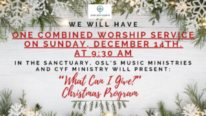 We will have One Combined Worship Service on Sunday, December 14th at 9:30 am in the Sanctuary, OSL’s Music Ministries and CFY Ministry will present “What Can I Give?” Christmas program.